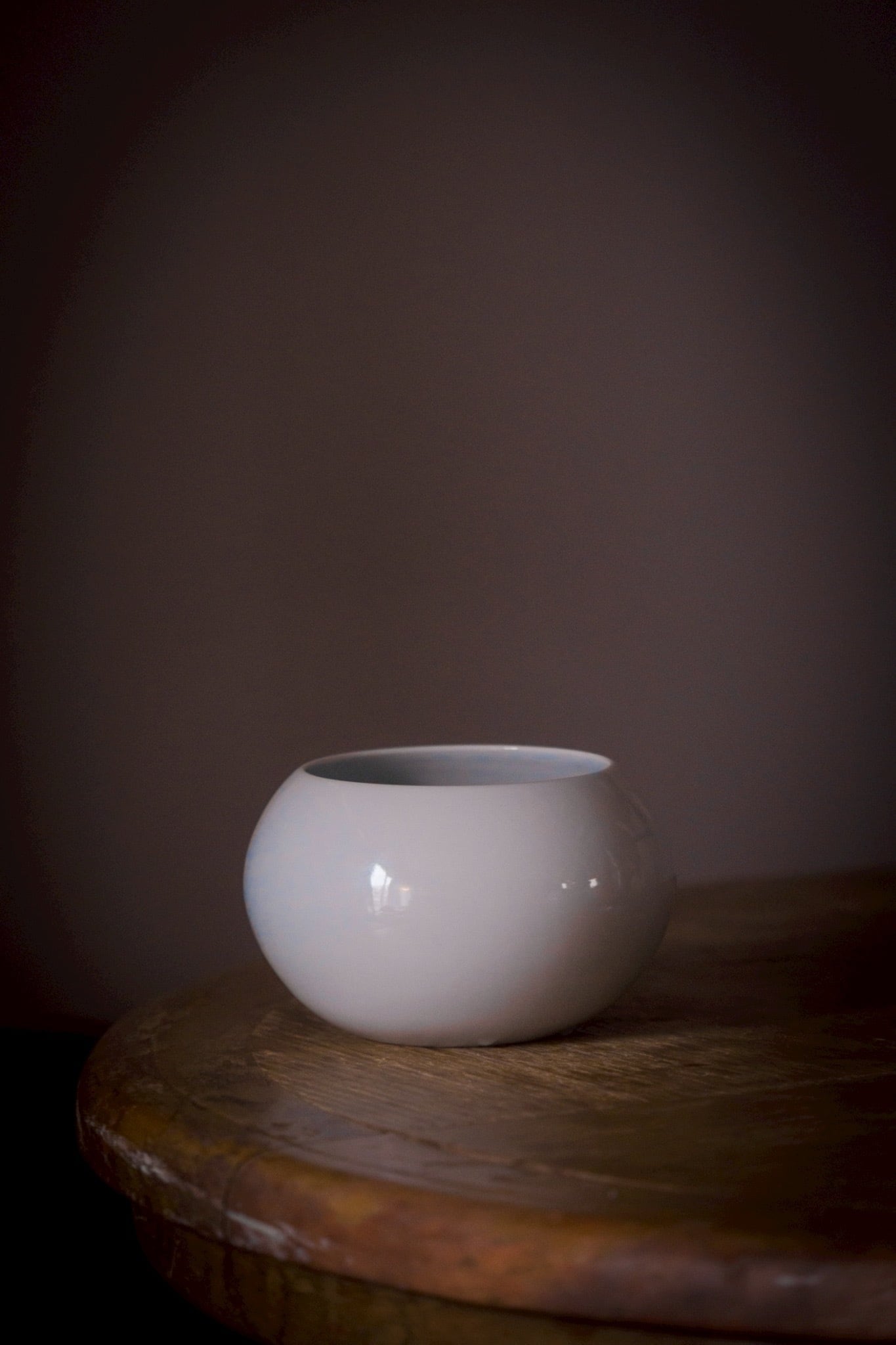 両手でそっと包みたくなるような形、手のひらに沿うように狭まっていく飲み口。