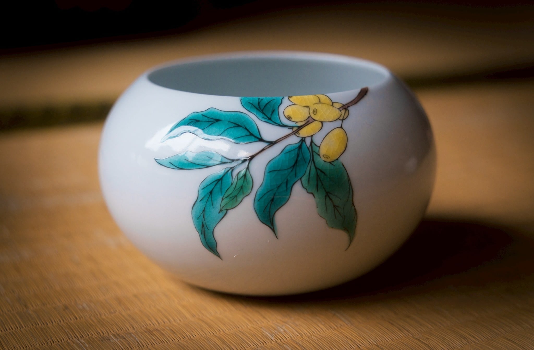 九谷焼らしい繊細な筆致の絵付けで、赤い果実と黄色の果実のコーヒーノキが表裏に描かれています。